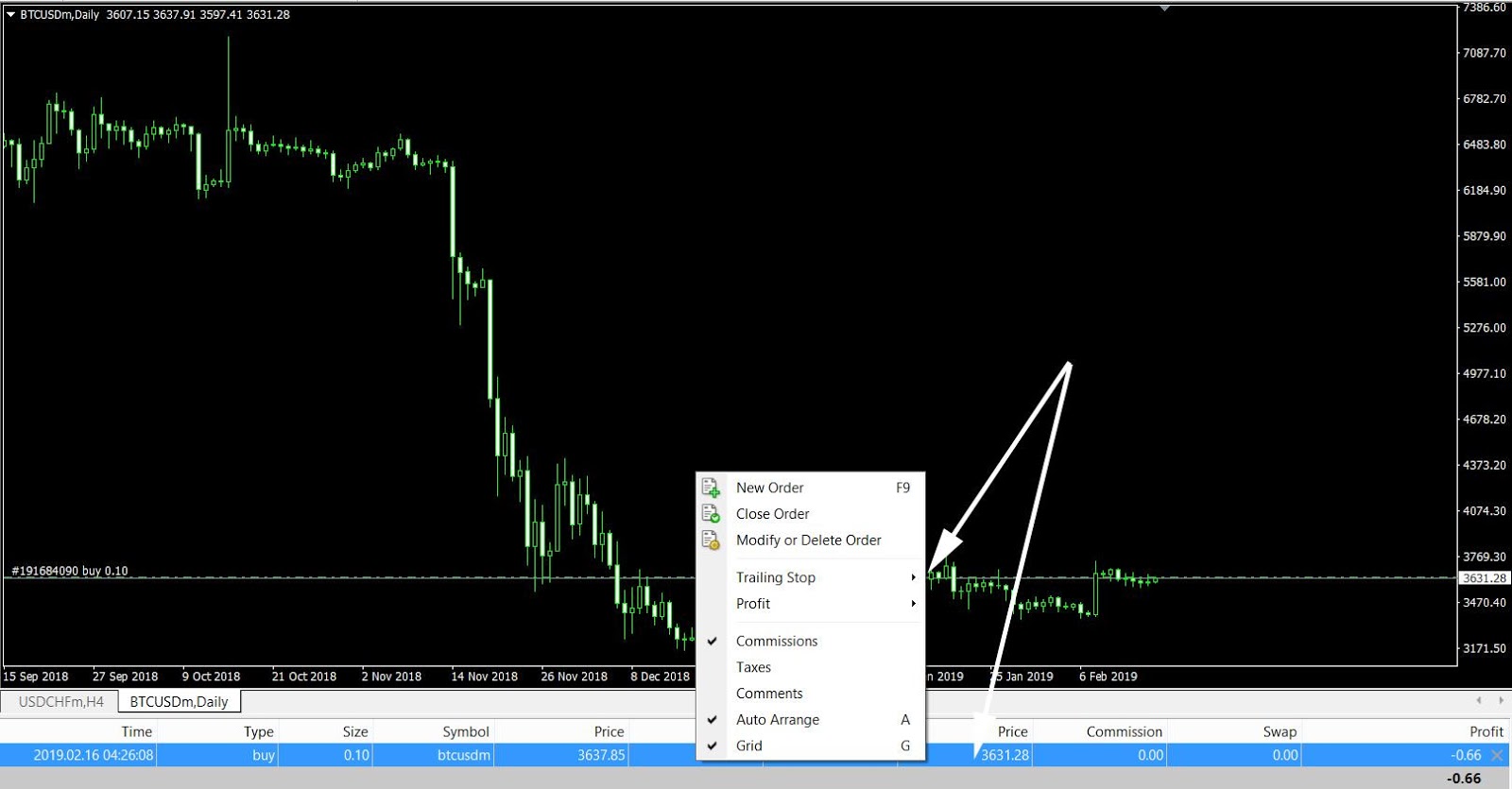 Để sử dụng chức năng này, bạn hãy nhấn chuột phải vào một lệnh đang mở bất kỳ, di chuột đến ô “Trailing Stop” và chọn mức dịch chuyển tự động như mong muốn, hoặc chọn Custom để cài đặt theo nhu cầu.