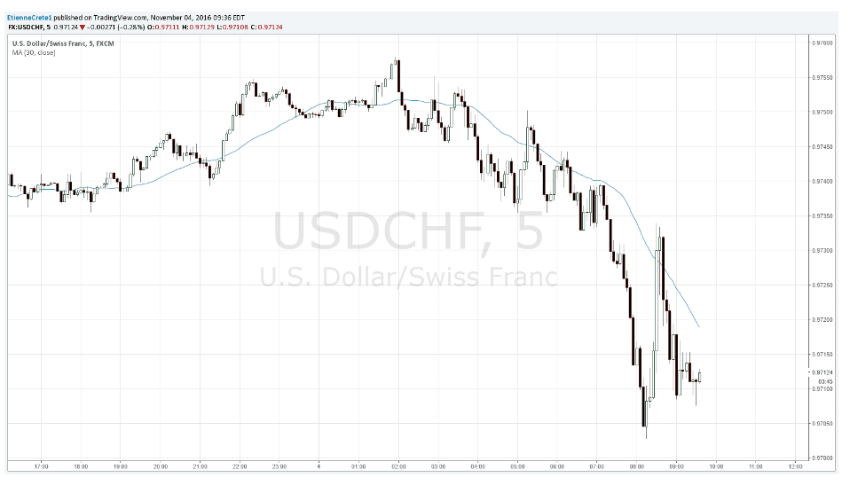 Có thể thấy USDCHF đã có xu hướng trước khi tin tức được công bố nhưng xu hướng đó vẫn không thay đổi.