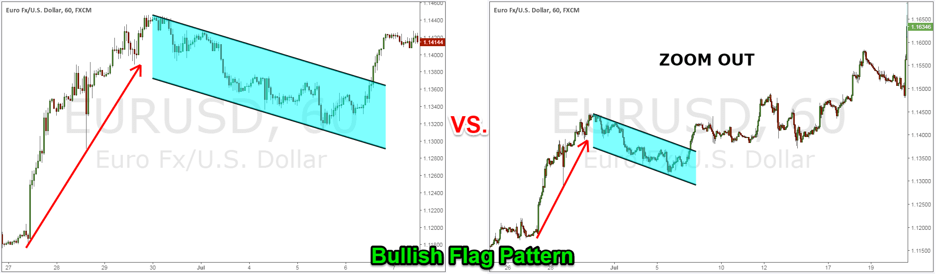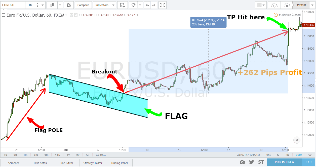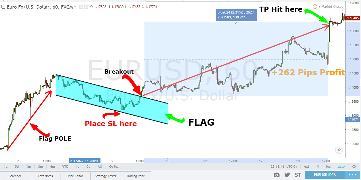 Chúng ta cần đợi giá phá vỡ mô hình và tìm tín hiệu để mua theo xu hướng tăng. Điểm vào lệnh nên ở phía trên cạnh trên của mô hình cờ hoặc phía trên đỉnh của mô hình. Các bạn có thể thu nhỏ biểu đồ lại sẽ thấy rõ hơn mô hình này, như hình bên dưới:
