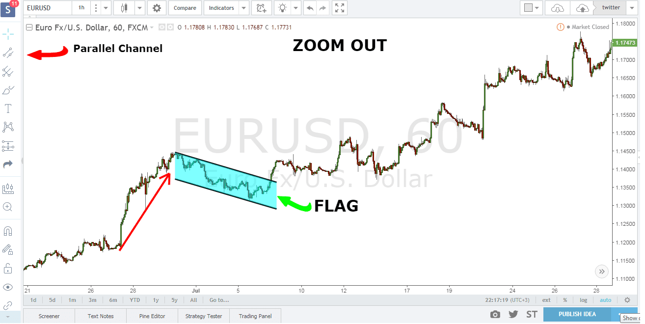 Thu nhỏ biểu đồ để chúng ta xác định dễ dàng hơn mô hình cờ tăng. Các bạn có thể dùng đường xu hướng để xác định mô hình này dễ dàng hơn.