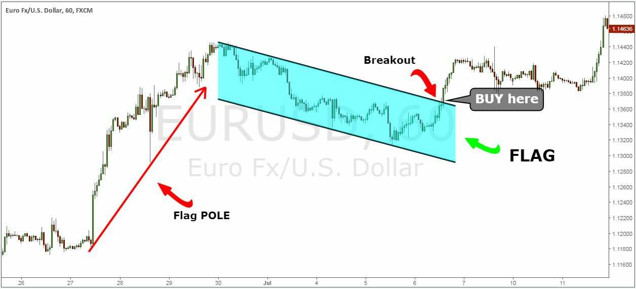 Khi giá phá vỡ mô hình cờ tăng, chúng ta có thể vào lệnh mua khi giá phá vỡ lên trên cạnh trên của mô hình cờ tăng. Như hình bên dưới: