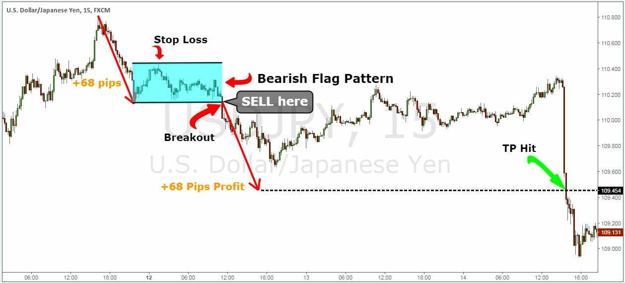 Trên đây là chiến lược mua đối với mô hình cờ tăng. Đối với chiến lược bán với mô hình cờ giảm, chúng ta tư duy ngược lại nhé. Hình dưới là nguyên tắc của lệnh bán với mô hình cờ giảm: