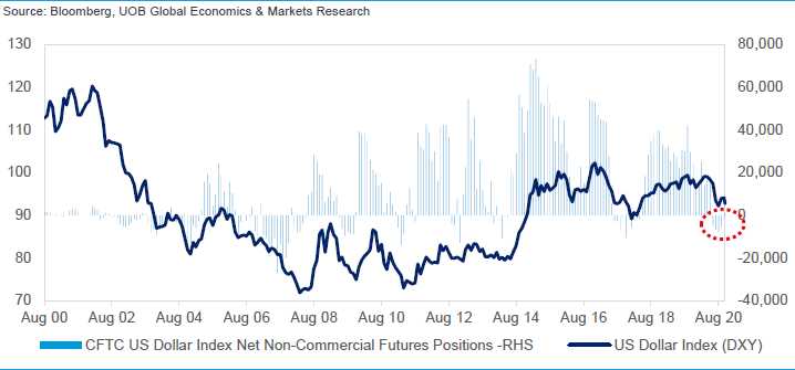 - Thứ hai, mặc dù vị thế các hợp đồng tương lai của đồng USD hiện ở trạng thái bán ròng, quy mô hiện tại vẫn là khá khiêm tốn và chưa có dấu hiệu sẽ mở rộng mạnh trong ngắn hạn. Xu hướng bán khống ngắn hạn đồng USD bắt đầu từ tháng 6 năm nay đang dần trở thành một chiến thuật trường kỳ và dài hơi hơn trong dài hạn.