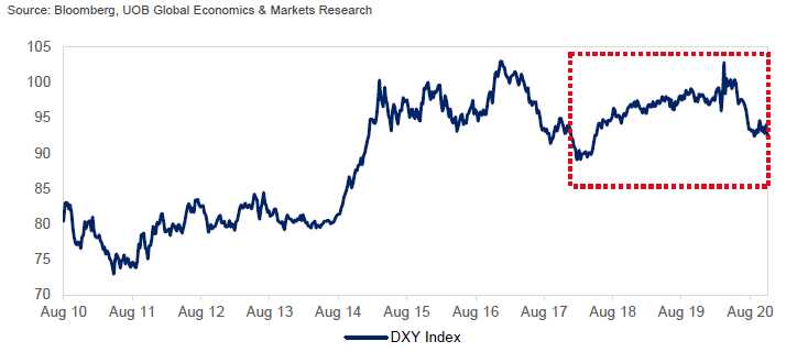 - Thứ ba, sau khi bị bán tháo mạnh mẽ trong vài tháng trở lại đây, rất nhiều nhà đầu tư đang tự hỏi rằng liệu đồng USD đã chạm đáy hay chưa? Đúng là đồng USD đã giảm rất mạnh từ mức 100 vào tháng 5 xuống còn khoảng 93 vào thời điểm hiện tại. Tuy vậy, nếu nhìn rộng ra diễn biến trong 10 năm qua, một bức tranh lớn khác đang dần hiện ra. Có thể thấy đà giảm vừa qua mới đang chỉ là một nhịp thoái lui của USD sau đà tăng mạnh mẽ kể từ khi cuộc chiến tranh thương mại Mỹ-Trung bùng phát vào năm 2018. Chúng tôi vẫn giữ quan điểm rằng việc Fed duy trì chính sách tiền tệ nới lỏng sẽ khiến cho đồng USD tiếp tục suy yếu trong một vài quý tới và có thể sẽ trở lại ngưỡng hỗ trợ tâm lý 90.