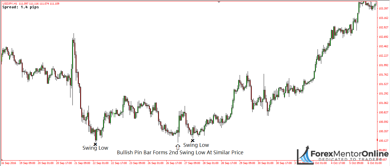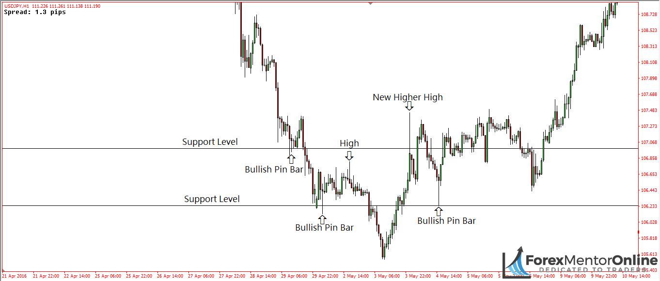 Market tạo ra 1 đỉnh cao hơn cho thấy xu hướng giảm đã suy yếu. Thanh pin bar tăng giá xuất hiện sau đó là setup buy rất tuyệt vời.
