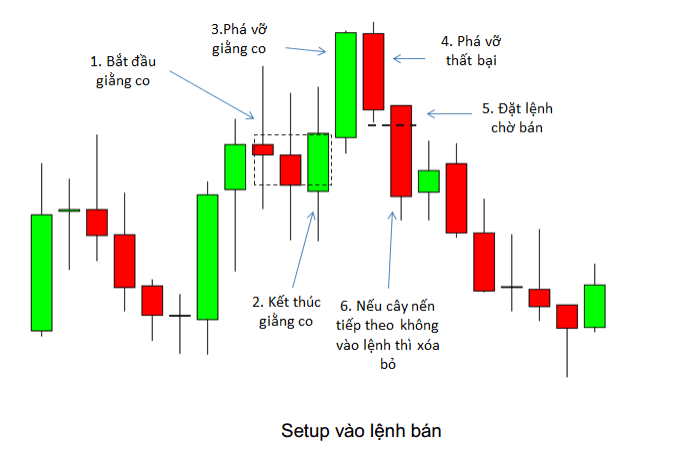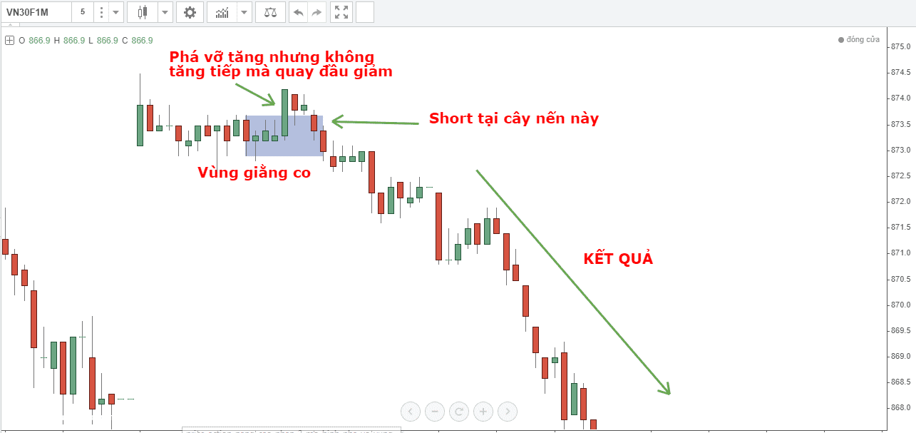 Theo như ví dụ này, vùng giằng co đã diễn ra trong 5 cây nến, cây nến thứ 6 phá vỡ vùng giằng co và đi lên, nhưng cây nến thứ 7 lại không tăng mà giảm xuống cho thấy cây nến thứ 6 và thứ 7 là hành động phá vỡ thất bại. Đây chính là tín hiệu bán cực đẹp trong thời điểm này.