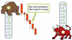 Bạn có để ý thấy hình con bò (bulls) và con gấu (bears)? Con bò đại diện cho phe mua (kỳ vọng thị trường tăng), con gấu đại diện cho phe bán (kỳ vọng thị trường giảm). Tại đó có các thang điểm từ 0 đến 10. Đây là một trò chơi có tổng bằng 10, nếu 1 trong 2 ở thang điểm 10 thì nó sẽ kiểm soát xu hướng của thị trường. Khi cả 2 cùng nằm ở thang điểm 5 thì không ai kiểm soát thị trường và nến quay đầu sẽ xuất hiện. Ngay sau khi nến quay đầu xuất hiện, cuộc chiến sẽ tiếp tục và bên nào chiếm ưu thế hơn thì thị trường sẽ di chuyển theo kỳ vọng của bên đó.