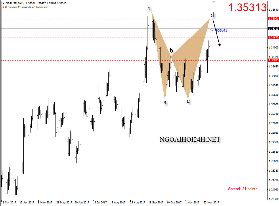 Mô hình harmonic là ” Bearish gartley” có khả năng hoàn thiện điểm D của mô hình khi giá tiếp cận lại vùng đỉnh của GBPUSD hồi tháng 9 đó là quanh mốc tâm lý 1.36.