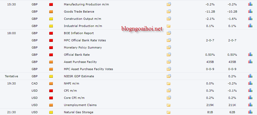 Tiếp theo lúc 18h Công Bố Chính Sách Lãi Suất + Báo Cáo Lạm Phát Quý. Lãi suất kỳ này dự báo giữ nguyên ở mức 0.5%, nhà đầu tư sẽ chú ý nhiều hơn đến số người bỏ phiếu-Lần trước là 2-0-7, tức 2 người muốn tăng lãi suất, 0 người muốn giảm, 7 người muốn giữ nguyên -Nếu kỳ này có thêm người nào bỏ phiếu tăng lãi suất cho GBP thì cặp tiền GBPUSD sẽ bật tăng mạnh.
