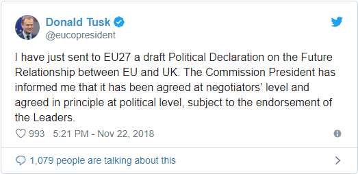 Bảng Anh tăng mạnh trên các tin tức Brexit rằng Anh và EU đã nhất trí về dự thảo tuyên bố chính trị về mối quan hệ trong tương lai. Nó cũng được xác nhận bởi tweet của Tổng thống Hội đồng Châu Âu Donald Tusk. Dự thảo hiện nay là “chịu sự tán thành của các nhà lãnh đạo” của EU. Thủ tướng Anh Theresa May sẽ đưa ra tuyên bố lúc 21h30 theo giờ Việt Nam.
