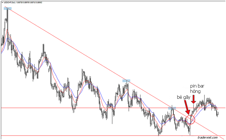 Một trendline bị bẻ gãy cho chúng ta biết rằng trend đang yếu đi. Không nhất thiết rằng trend đã hết nhưng chúng ta cần quan sát khi trade pin bar sau cú bẻ gãy đó.