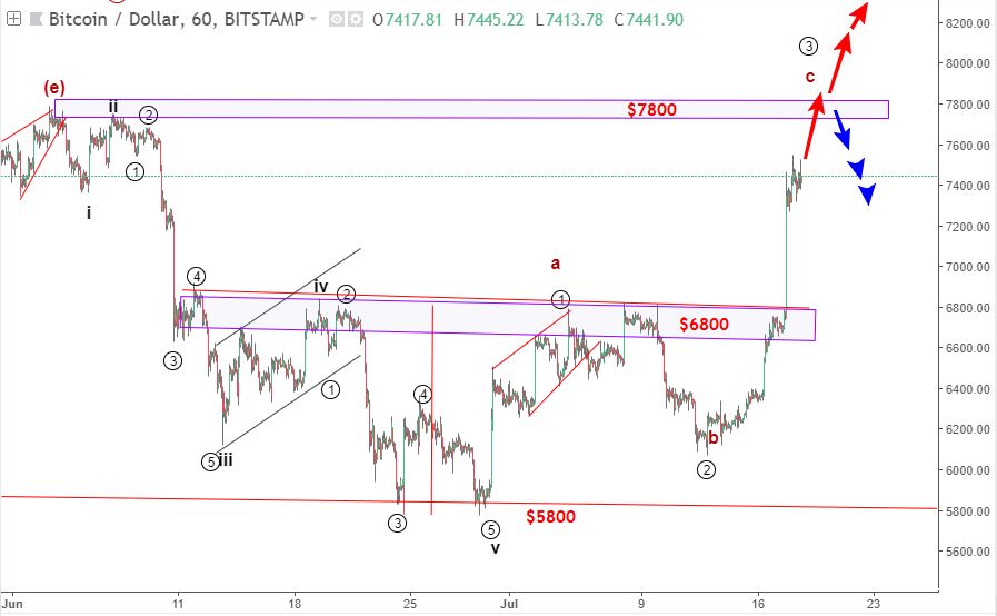 Trong bản cập nhật cuối cùng của chúng tôi ngày hôm qua, trước đợt tăng điểm lớn, chúng tôi đã giải thích mức độ quan trọng của các nhà đầu cơ giá phá vỡ trên ngưỡng kháng cự $6800. Trong những tuần gần đây, giá đã cố gắng hơn hai lần để vượt qua ngưỡng này. Việc phá vỡ trên $ 6800 là bước đột phá của những con bò cần cho một số không khí trong lành. Trước khi đột phá, chúng tôi đã thấy hai mô hình đảo chiều quan trọng xác nhận mức thấp $ 5800. Với sự bứt phá này, có vẻ như không thể tránh khỏi khi giá chạm ngưỡng kháng cự tiếp theo tại $7800. Hãy xem lại bản cập nhật cuối cùng nơi biểu đồ bên dưới được sử dụng.