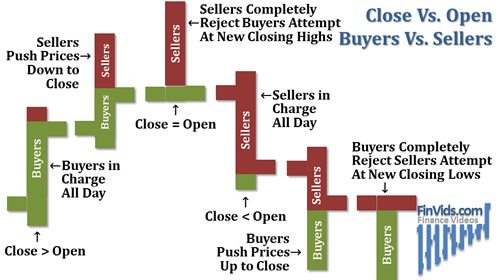 Giá đóng cửa sẽ rất hữu ích khi phân tích mối quan hệ của nó với giá cao nhất và thấp nhất, với giá mở cửa của ngày, và với giá đóng cửa của ngày hôm trước. Như đã nói, nếu giá đóng cửa cao hơn giá mở cửa thì thanh giá đó được gọi là “ngày giá tăng”. Nếu giá đóng thấp hơn giá mở thì ngày hôm đó sẽ là “ngày giá giảm”.