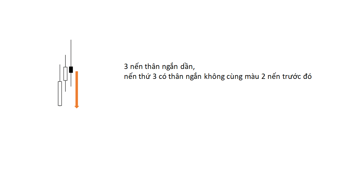 Đặc điểm: • Là 3 nến tăng hoặc 3 nến giảm có thân nến nhỏ dần (ngắn dần) • Nến thứ 3 nên là nến có thân ngắn, càng ngắn càng tốt • Nến 3 có thể là nến thân ngắn không cùng màu với 2 nến trước đó