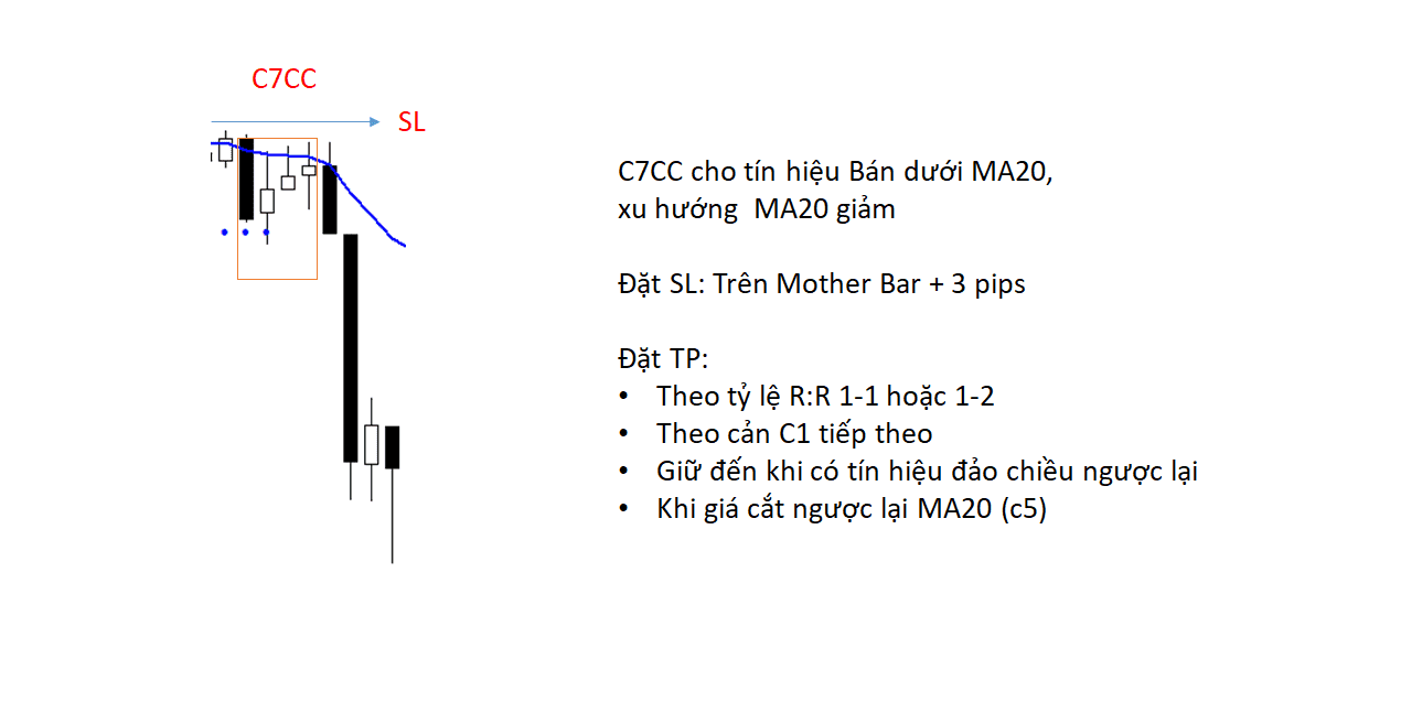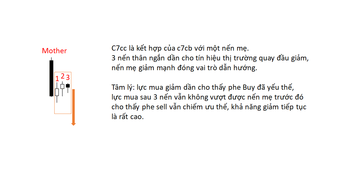 C7CC là kết hợp của C7CB với một nến mẹ. 3 nến thân ngắn dần cho tín hiệu thị trường quay đầu giảm, nến mẹ giảm mạnh đóng vai trò dẫn hướng.