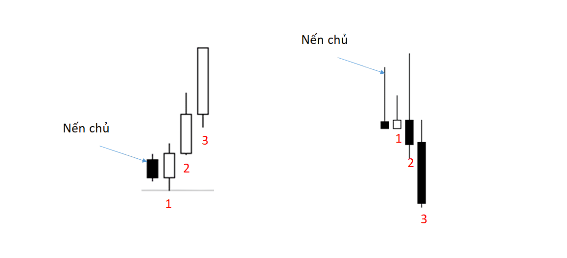 • 3 nến thân tăng dần (lớn dần) cho thấy thị trường đang tăng/giảm đến cực điểm (buy/sell climax), thị trường nhiều khả năng rơi vào trạng thái quá mua/quá bán (over bought/ over sold). • Nến chủ ngược cho thấy 3 nến tăng dần ngược với hướng đi trước đó của thị trường.