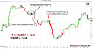 Theo Al Brooks, mô hình 2 chân sóng hình thành trong đợt giá hồi khi giá tương tác với đường trung bình động. Đây là một trong những cách trade quan trọng khi xu hướng đang mạnh.
