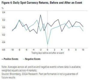 Trái ngược với hầu hết các yếu tố kinh tế, các vấn đề địa chính trị thường có tần suất xuất hiện ít hơn, nhưng tác động thì lớn hơn rất nhiều. Chúng ta đang trải qua một trong nhưng thời kỳ bất ổn nhất về địa chính trị, từ đại dịch COVID-19 chưa từng có đến căng thẳng Mỹ – Trung, và cuộc bầu cử tổng thống Hoa Kỳ. Chúng đều đang khiến cho thị trường forex chao đảo. Như biểu đồ bên dưới cho thấy, thị trường sẽ có nhiều rung lắc hơn khi một sự kiện quan trọng được diễn ra, đặc biệt khi những sự kiện đó tác động tiêu cực cho đồng tiền đang được xem xét.