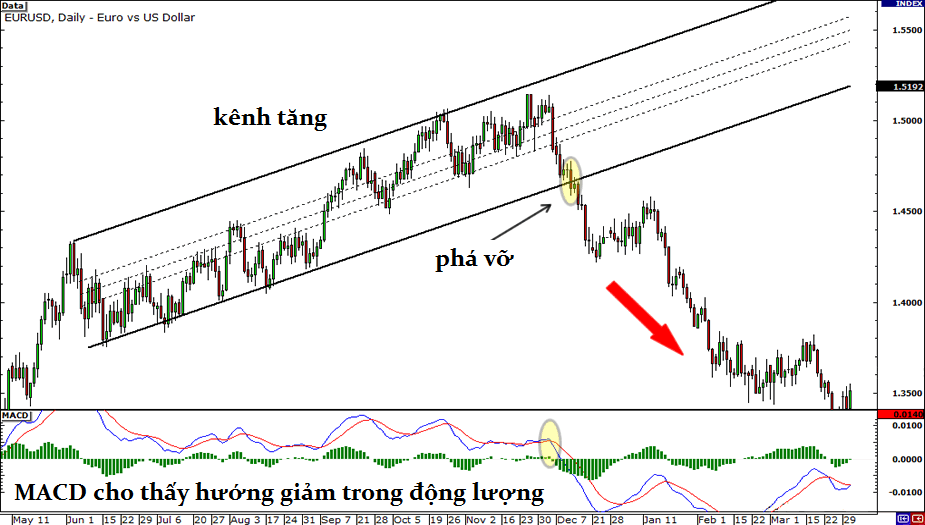 Chú ý rằng EURUSD đã phá vỡ đường xu hướng và MACD cho thấy động lực giảm. Sử dụng thông tin này, chúng ta có thể an toàn mà nói rằng phá vỡ sẽ tiếp tục đẩy giá của EU giảm và nếu là một trader, chúng ta có thể bán cặp tiền này