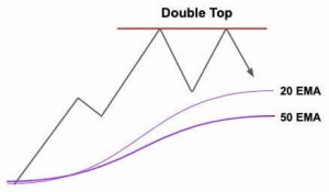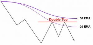 Mô hình 2 đỉnh là mô hình giảm giá trong xu hướng tăng, tức là mô hình này nằm trên EMA 20 và EMA 50: