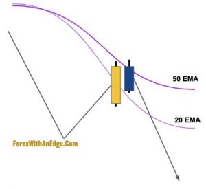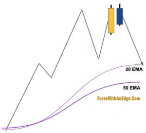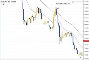 Bạn có thể sử dụng đường trung bình mà bạn quen thuộc, trong bài viết này, tác giả gợi ý sử dụng 2 đưởng EMA 20 và EMA 50. Hình bên dưới là mô hình The Dark Cloud Cover xuất hiện ở đường trung bình EMA 20 trong cú hồi của xu hướng giảm: