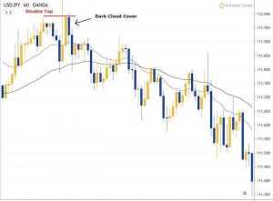 Hoặc là như hình trên, mô hình hai đỉnh xuất hiện trong cú hồi xu hướng giảm, retest với đường EMA trong cú hồi này và tạo mô hình Dark cloud cover ở đỉnh số 2: