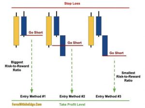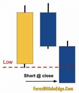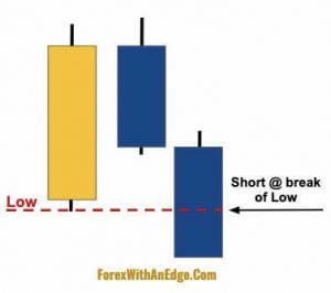 Cách 3: Vào lệnh khi giá đóng cửa bên dưới giá thấp nhất của nến đầu tiên Đây là cách thức thận trọng nhất, điểm vào lệnh ở cách này không được lợi thế như hai cách trước đó, nhưng nó có thêm sự xác nhận giá tiếp tục đi xuống: