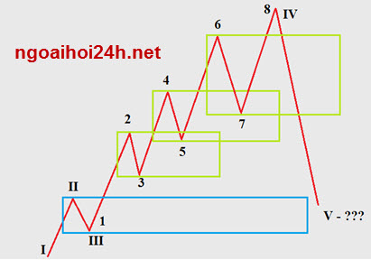Trong hình, bạn có thể thấy sau khi phá đỉnh (II), giá không quay về vùng điều chỉnh của xu hướng lớn (màu xanh biển) mà cứ liên tục hình thành những mức giá cao hơn (4, 6, 8). Giá phá ngưỡng đáy (7), xu hướng tăng nhỏ bị phá nhưng xu hướng lớn vẫn chưa bị phá và thị trường vẫn được cho là có xu hướng tăng.