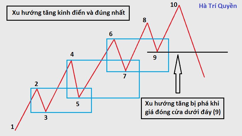 - Cách xác định đỉnh của 1 xu hướng tăng: đỉnh mới của xu hướng tăng được hình thành trong quá trình giá phá đỉnh cũ và có giá đóng cửa cao hơn giá cao nhất của đỉnh cũ. Đỉnh mới được công nhận khi và chỉ khi xuất hiện sóng điều chỉnh và sóng điều chỉnh phải có giá đóng cửa trong vùng điều chỉnh.