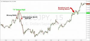Đối với breakout đỉnh đáy, cũng tương tự như breakout kháng cự hỗ trợ, nhưng ta cần thêm một bộ lọc. Bộ lọc đó chính là mô hình chữ “V”. Tức là chúng ta chỉ giao dịch breakout ở mô hình chữ V. Như hình bên dưới: