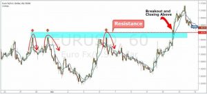 Giao dịch breakout là nỗ lực của thị trường khi đẩy giá ra khỏi một vùng giá quan trọng. Một cú breakout chất lượng thường đi kèm với khối lượng giao dịch tăng cao. Dưới đây là ví dụ về cú breakout khỏi ngưỡng kháng cự: