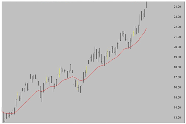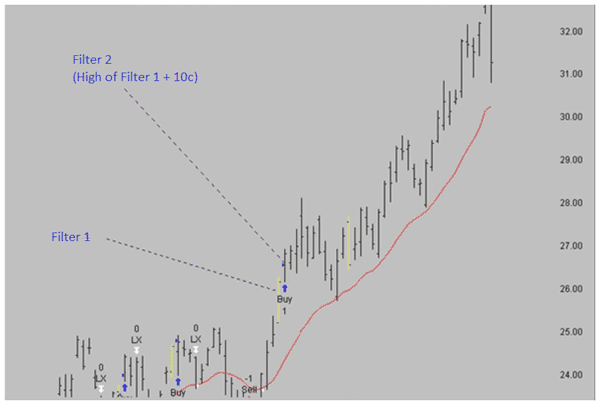 Vì vậy, trong một xu hướng tăng, chúng ta cần giá di chuyển lên đường trung bình và giá thấp nhất của 2 ngày đó nằm phía trên đường trung bình (điều kiện 1). Sau đó, mức cao nhất trong hai ngày đó bị phá vỡ (điều kiện 2).