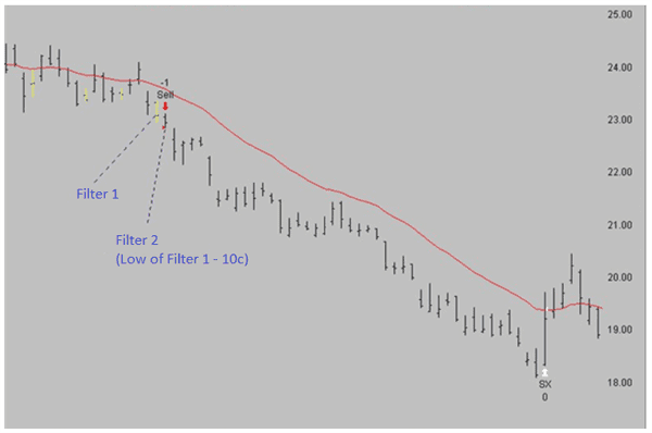 Trong một xu hướng giảm, ta chờ thị trường giảm qua đường trung bình và giá cao nhất hai ngày đều nằm dưới đường trung bình đó. Sau đó, lấy mức giá thấp nhất trong hai ngày trừ đi 1 pip để xác định điểm phá vỡ và giao dịch. Đó chính là điều kiện thứ 2. Đó cũng là điểm ta đặt sell stop. Thị trường phá vỡ mức giá thấp nhất trong hai ngày và sẽ khớp lệnh chờ bán của chúng ta.