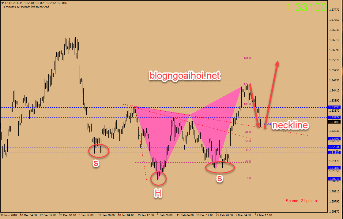Cặp tiền USDCAD đã quay trở lại test lại đường cổ neckline của mô hình vai đầu vai ngược. Khả năng USDCAD tăng trở lại là cao.