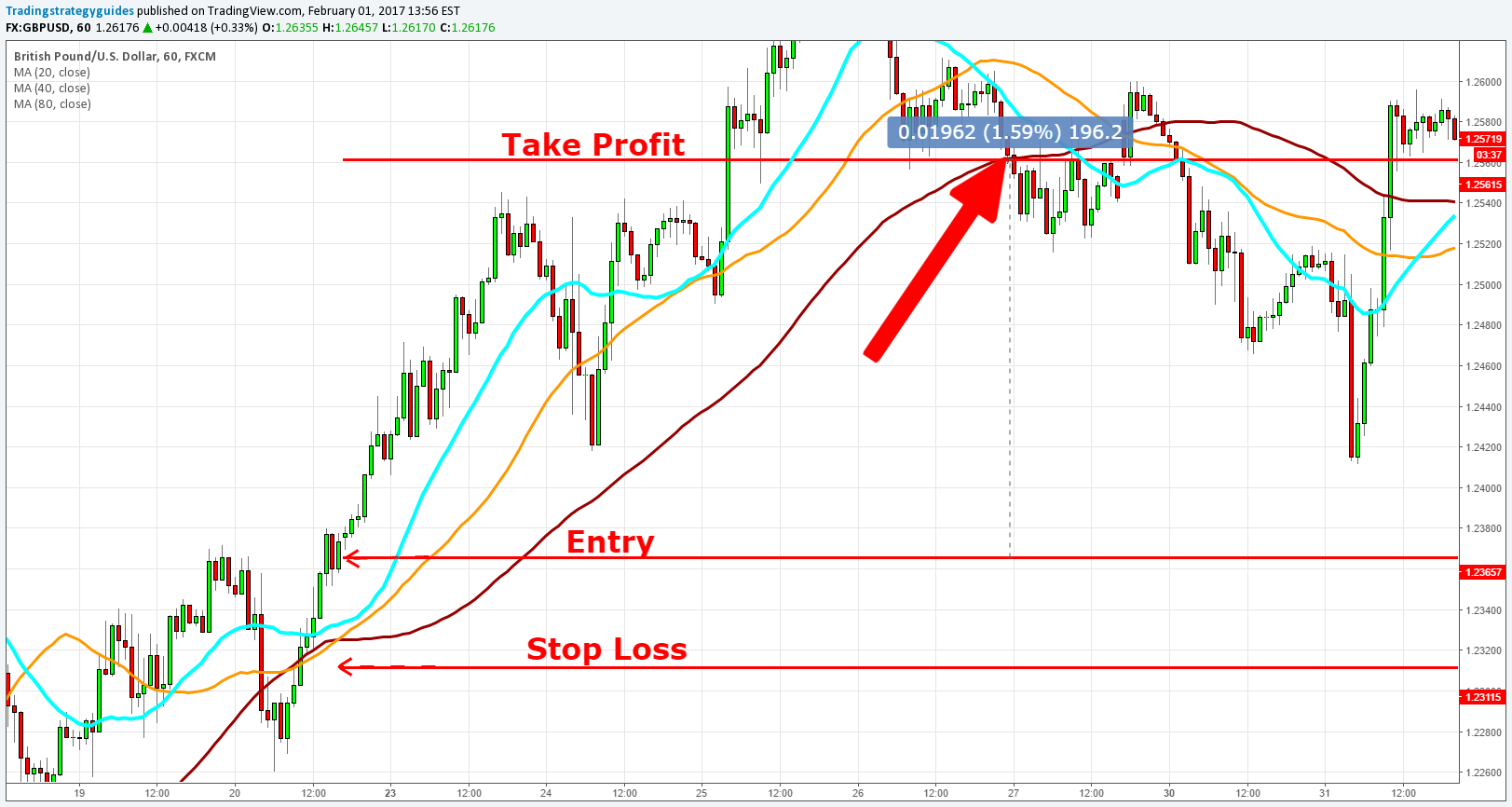 Stop Loss bên dưới đường khu vực MA Take Profit khi giá chạm lại đường MA 80