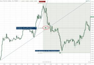 Như vậy, khác với cách dùng Measure Move theo chiều dài sóng đẩy khi giao dịch theo xu hướng, trade đảo chiều anh em sẽ sử dụng độ dài từ đỉnh đến vùng breakout để xác định điểm chốt lời sau khi giá breakout đường trend line.