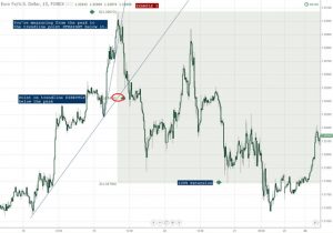 Trong chart này, nếu trường hợp giá breakout và đâm xuyên thành công đường trend line chính của xu hướng thì khả năng giá sẽ đi được bao xa? Lúc này chúng ta sẽ đo Measure Move từ đỉnh đến khu vực breakout đường trend line để xác định điểm chốt lời.