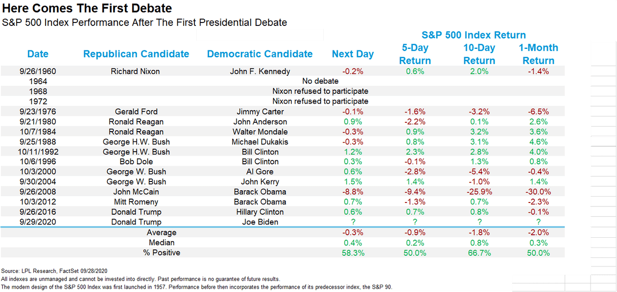 Những cuộc tranh luận tổng thống gây ảnh hưởng thế nào lên thị trường? Tính từ những năm 1960 đến nay, khi lịch trình các cuộc tranh luận trên truyền hình bắt đầu trở nên cố định hơn, chỉ số S&P 500 đã giảm vào ngày hôm sau ở mức -0.5%; mở rộng ra thời điểm 5 ngày, 10 ngày và 1 tháng sau cuộc tranh luận, kết quả lần lượt là -0.9%, -1.8% và -2%.