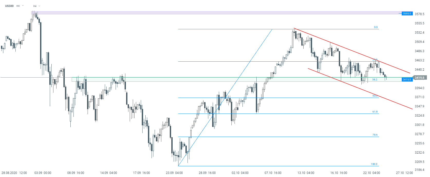 US500 đạt đỉnh vào giữa tháng 10 và bắt đầu giảm xuống trong kênh giá giảm. Chỉ số đã thoái lui khỏi đỉnh của kênh và hiện đang giảm qua hỗ trợ ở mức 3,415 điểm, cũng trùng với mức thoái lui 38.2% của động thái đi lên gần đây. Việc phá vỡ dứt khoát bên dưới nó sẽ mở đường cho giới hạn dưới của kênh gần mức thoái lui 50%. Tuy nhiên, báo cáo GDP sắp tới của Mỹ và thu nhập của Big Tech có khả năng lật ngược tình thế. Liệu điều đó có xảy ra? Chúng ta sẽ biết vào thứ Năm này! Nguồn: xStation5