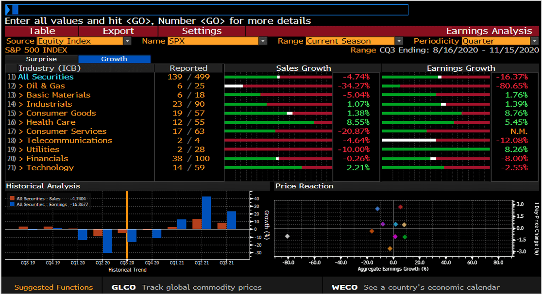 Cho đến nay, khoảng 140 công ty thuộc chỉ số S&P 500 đã báo cáo kết quả kinh doanh quý 3. Như có thể thấy trên biểu đồ trên, cả doanh số bán hàng và thu nhập đều cao hơn dự kiến nếu xét tổng thể chỉ số. Các công ty dầu mỏ, công ty khai thác và cổ phiếu tài chính đã mang lại những bất ngờ lớn nhất về thu nhập khi giá hàng hóa phục hồi và thị trường giao dịch trên Phố Wall tiếp tục diễn ra. Tình hình có một chút trái chiều khi nói đến dữ liệu bán hàng – hầu hết các ngành mang lại kết quả tốt hơn mong đợi nhưng ngành tiện ích lại không như kỳ vọng. Tuy nhiên, người ta nên nhớ rằng các nhà phân tích có xu hướng đánh giá thấp thu nhập của các công ty Hoa Kỳ, do đó không nên quá đặt nặng việc các báo cáo tốt hơn dự kiến.