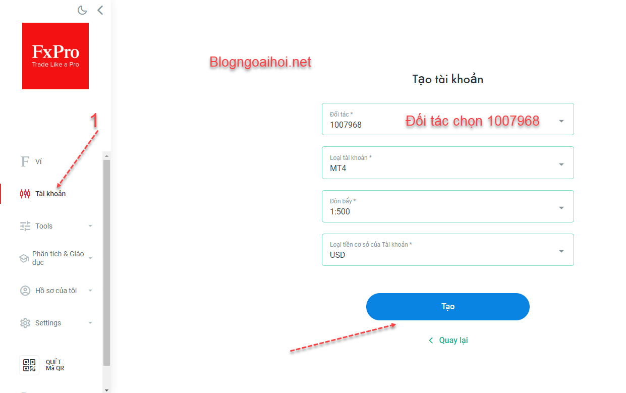 B4: Mục “Đối tác” các bạn chọn 1007968 ( đây là mã số IB của blog ngoại hối).