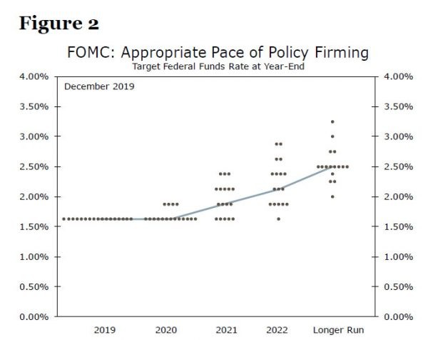 Hơn nữa, cái gọi là “biểu đồ dot plot”, gợi ý rằng hầu hết các thành viên ủy ban tin rằng sẽ phù hợp để giữ phạm vi mục tiêu không thay đổi trong suốt năm 2020 (Hình 2). Tuy nhiên, sự lây lan nhanh chóng trong những ngày gần đây của COVID-19 đến các quốc gia khác ngoài Trung Quốc đã khiến những người tham gia thị trường đưa ra kết luận rằng FOMC sẽ buộc phải nới lỏng chính sách.