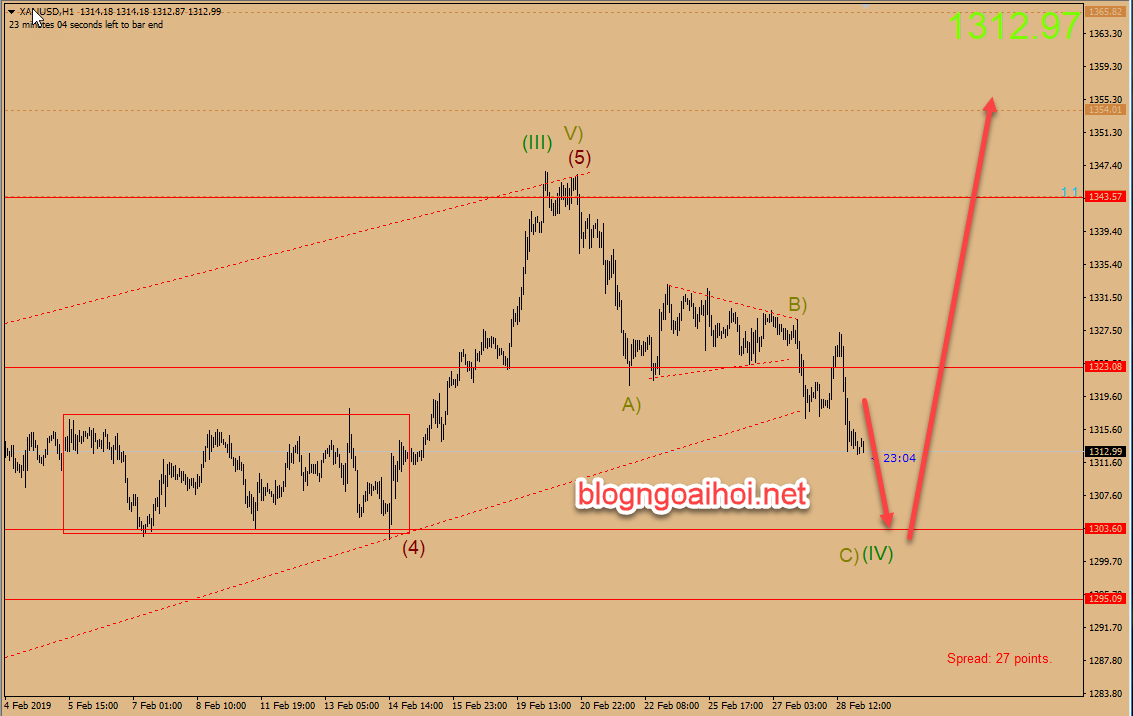Khả năng vàng sẽ tiếp tục suy giảm nhẹ vào hôm nay về 1305 để hoàn thiện sóng C) của (IV). Trước khi bật tăng mạnh trở lại.