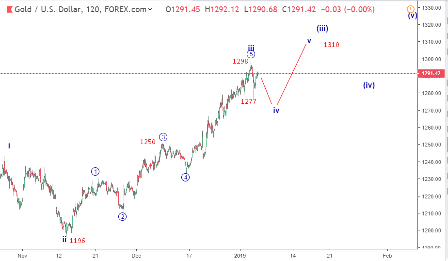 Chúng tôi dự kiến giá sẽ giảm từ khu 1288-1300 xuống khu 1265-1256. Mức giảm dự kiến có nghĩa là cho sóng phụ thứ 4 của sóng thứ 3 (iii). Sau khi giảm, giá sẽ tăng trên 1300 để hoàn thành sóng phụ thứ 5 của mức độ này. Giá giảm như dự kiến, chỉ dưới 1300, để nhanh chóng chạm mức 1277. Tuy nhiên, nó đã nhanh chóng được chọn với mức thoái lui đến 1290 như biểu đồ dưới đây cho thấy. Tiếp theo là gì?