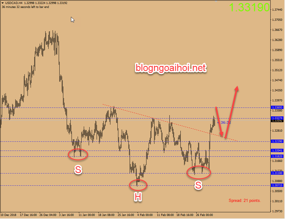 USDCAD có thể gặp trở ngại đôi chút ở vùng kháng cự 1.336. Tuy nhiên chúng ta có thể thấy, cặp tiền này đang di chuyển trong mô hình Vai đầu vai lớn. USDCAD đã phá vỡ đường cổ neckline. Về góc độ kỹ thuật, USDCAD có thể tiếp tục tăng trong thời gian tới.