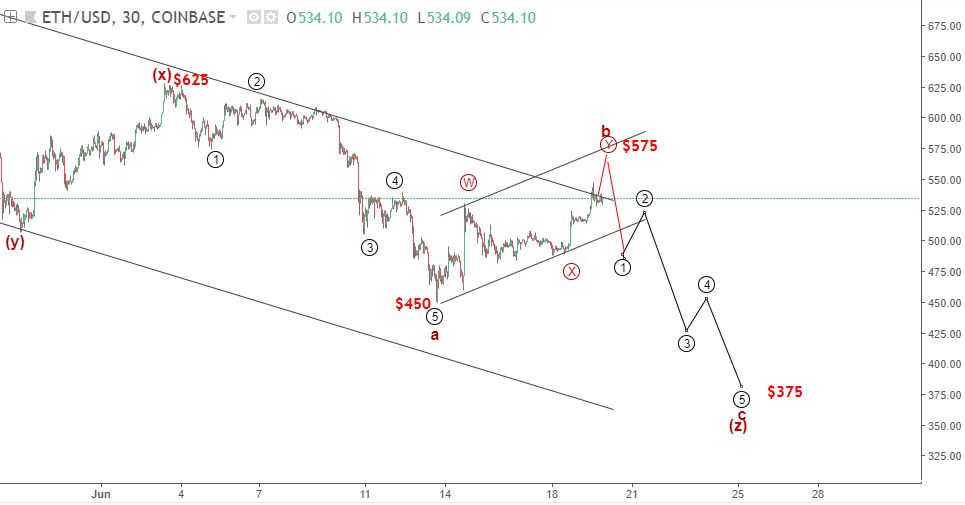 Tuần trước, Ethereum giảm xuống còn 450$. Tuần này cho đến nay, chúng tôi đã thấy rất ít sự phục hồi về giá của các đồng tiền Crypto chính. Ethereum hiện giao dịch trên $ 500. Nhưng cuộc tăng giá có vẻ hạn chế. Khi một xu hướng được thiết lập và giá điều chỉnh, thì giá sẽ tiếp tục theo hướng của xu hướng. Lý thuyết sóng Elliott có thể phân biệt giữa một xu hướng và điều chỉnh bằng cách xác định cấu trúc đặc trưng của chúng và xây dựng chúng thành các nhóm khác nhau.