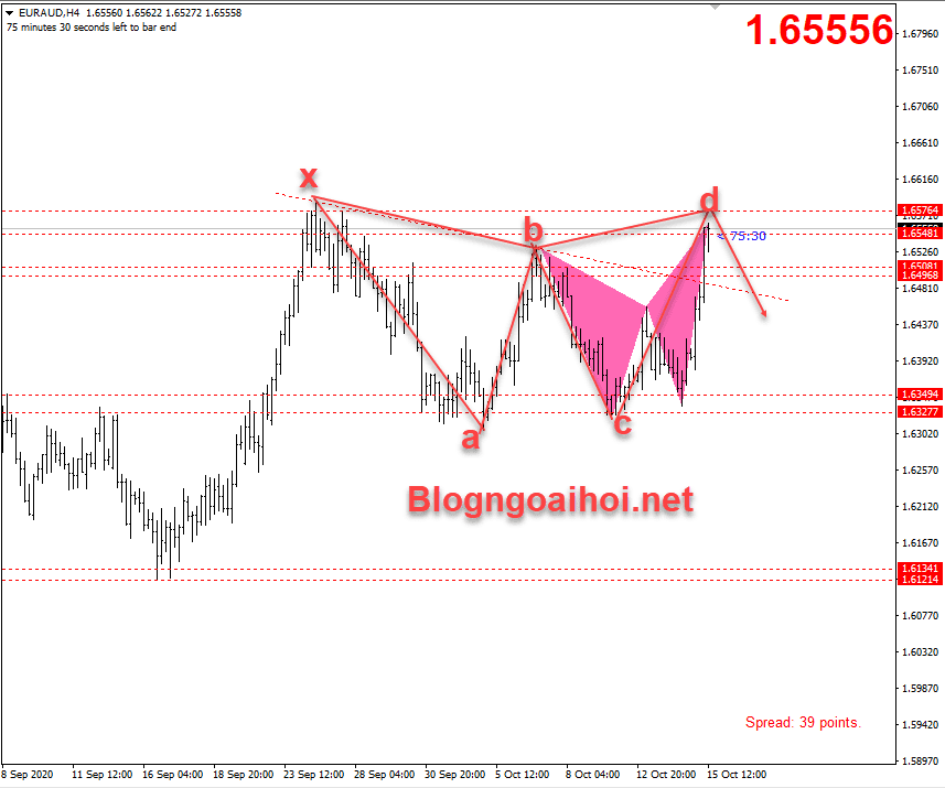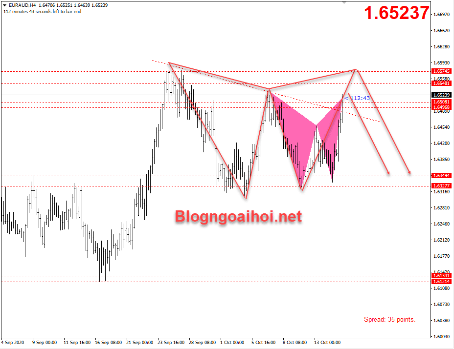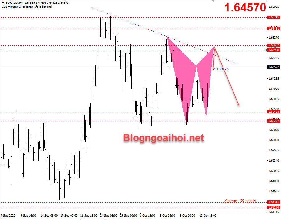 EURAUD 15/10- Cặp tiền EURAUD đã di chuyển tăng lên trên 1.6450 sau khi “Brexit bớt căng thẳng”. Tuy nhiên cặp tiền này có khả năng quay đầu giảm khi tin “Lao động úc” sáng nay công bố tốt và EURAUD cũng có mô hình giảm theo harmonic.