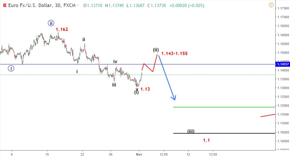 Sự phục hồi hiện tại có thể mở rộng lên 1.143 đến 1.155 trước khi giảm thêm. Nếu sóng thứ 5 tiếp tục là sóng impluse, giá sẽ đào sâu hơn 1,1. Chỉ có một sóng 5 ending diagonal sẽ giữ giá trên 1,12 trước khi một sự phục hồi tăng lớn sẽ được nhìn thấy. Nếu giá phá vỡ trên 1.162, kịch bản giảm trên biểu đồ 30 phút trên sẽ trở thành không hợp lệ.