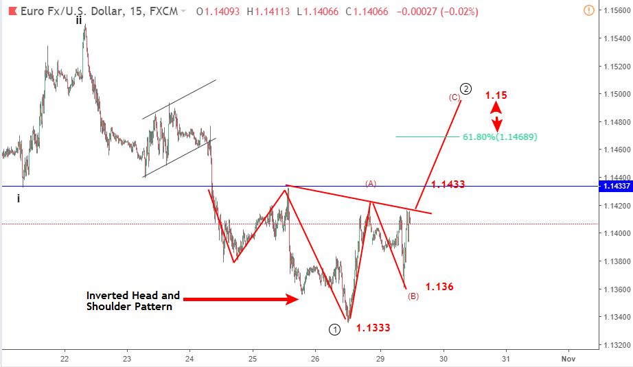 Biểu đồ trên nhìn vào EURUSD từ 1.181 (cuối tháng 9). Giá giảm từ 1.162 được dự kiến sẽ là một sóng impluse. Hiện tại, giá chưa đủ để xác định kỳ vọng này. Từ 1.181, giá đã làm cho mức thấp nhất thấp hơn và mức cao thấp hơn. Điều này cho thấy xu hướng giảm vẫn đang trong tầm kiểm soát. Các mức thấp nhất cuối cùng là 1.162 đến 1.155 và mức thấp nhất cuối cùng là 1.1433 đến 1.1333. Sự phục hồi hiện tại từ 1.1333 được dự đoán sẽ kết thúc dưới mức 1,155 cho chuỗi giảm điểm này để tiếp tục. Một động thái nhanh chóng trên 1,155 và 1,162 là dấu hiệu đầu tiên của chu kỳ tăng giá. Biểu đồ dưới đây cho thấy một mô hình đầu và vai với cơ sở tại 1,1333.