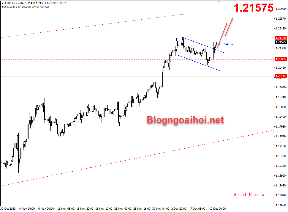 Cặp tiền EURUSD có thể tiếp tục mở rộng đà tăng sau khi phá vỡ “kênh giảm hay lá cờ”. Tuy nhiên EURUSD đang ở gần vùng đỉnh cũ cũng tiềm ẩn nhiều rủi ro giảm giá.
